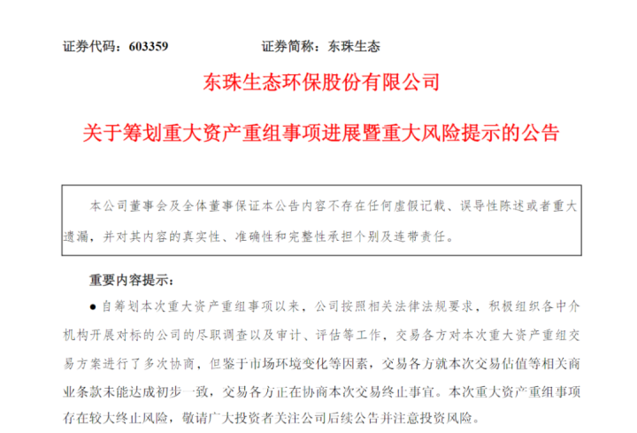 回溯交易筹划过程,东珠生态因筹划重大资产重组,股票自2025年8月27日开市起停牌。同年9月9日,公司召开了第六届董事会第三次会议,审议通过了《关于及其摘要的议案》等与本次交易相关的议案。公司股票于2025年9月10日复牌。复牌后股票连拉三个涨停板,此后回调。复牌后公司逐月披露一次进展公告,直至本次披露重大风险提示。