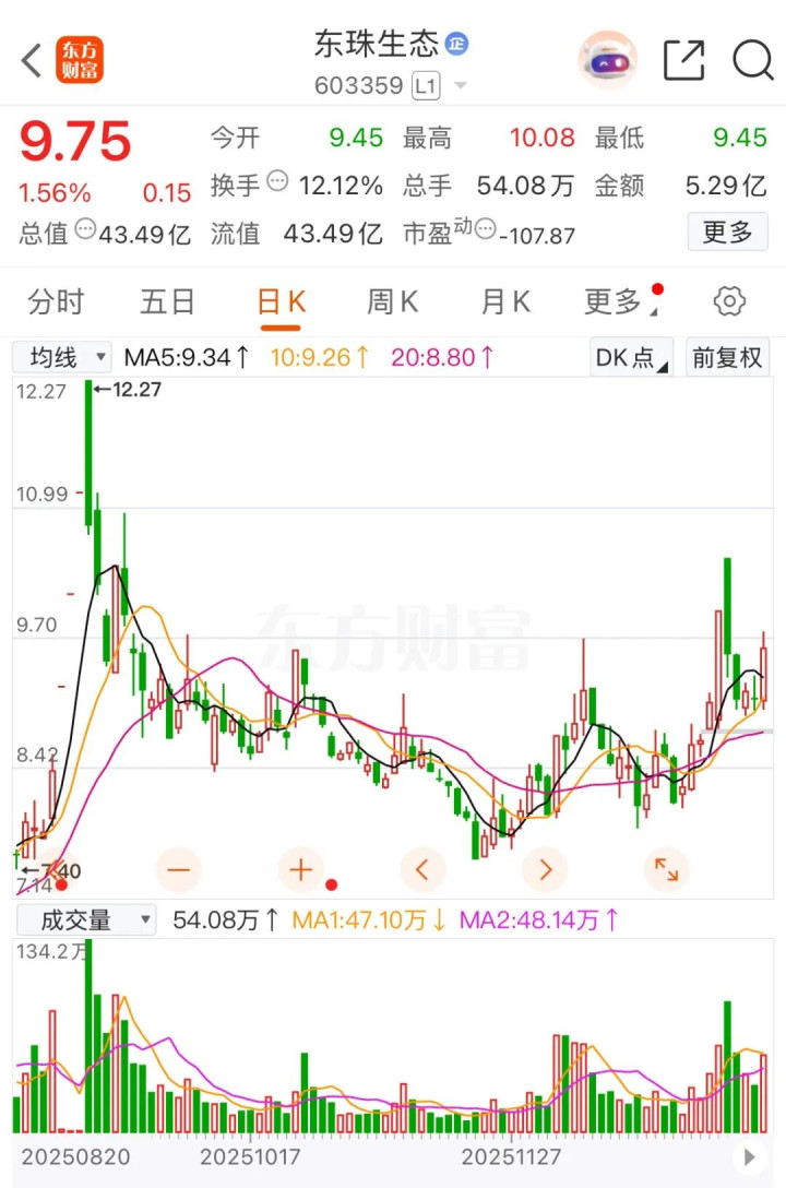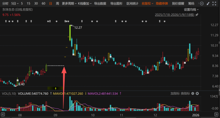 自预案发布以来,东珠生态被纳入商业航天、卫星通信等概念。在商业航天概念2025年11月下旬至今的上涨行情中,东珠生态股价从2025年11月21日的7.88元(开盘价)涨至今年1月9日的9.75元(收盘价),涨幅约23.7%。